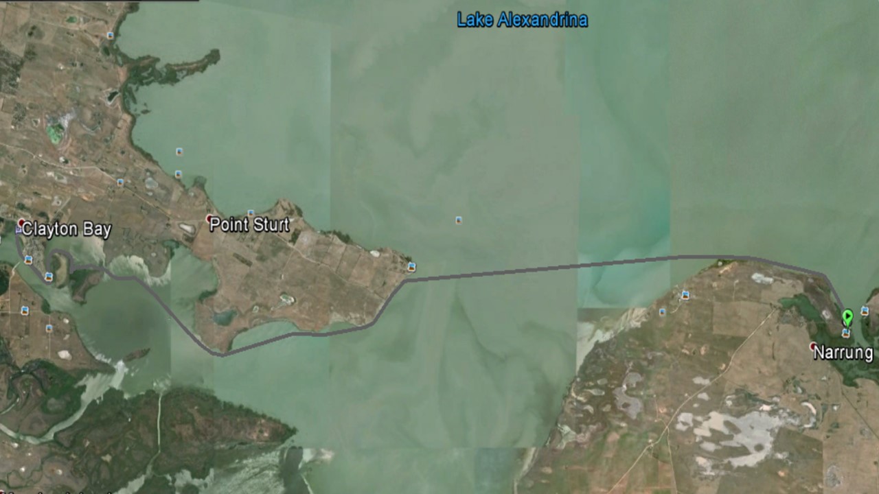 Followed the coast to keep out of the westerlies and had lunch at a point past Point Sturt. I could see the houses of Clayton’s Bay and Hindmarsh Island far in the distance and looking back, the open water of Lake Alexandrina towards Narung. Just myself and the environment for kilometers. In a few hours that would be over. I thought about that for some time. Sitting on shore, or in the magnificent machine, watching the birds and animals, and the river, would be over. While I loved the caravan parks, the towns and the people, the sadness that it would be over, as soon as I left that point, got to me. Getting to Goolwa and the barrage was important, but emotionally, leaving that world, affected me the most.