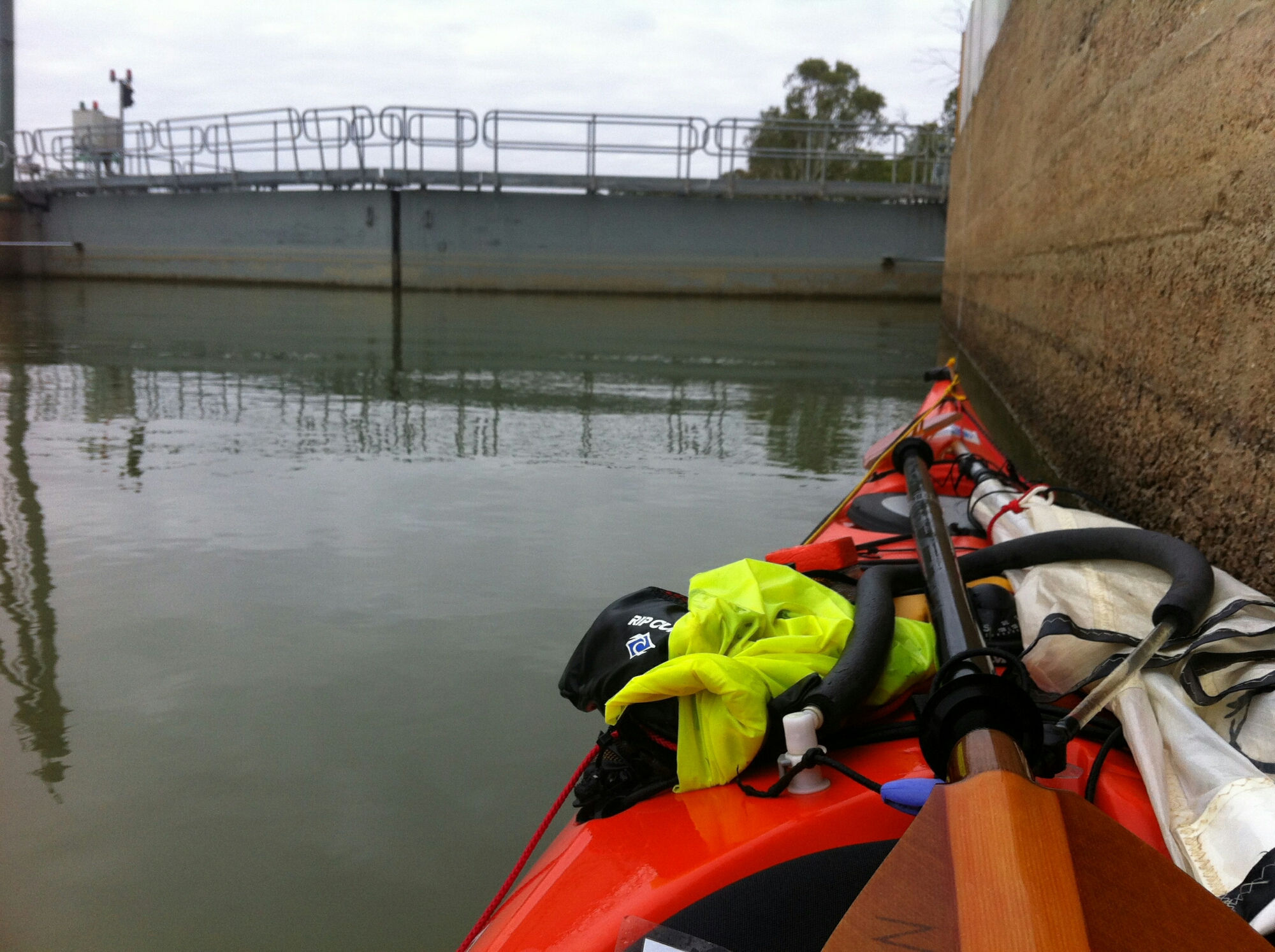 5 kilometres from the mouth and the end of the trip. (The real mouth that is) Left with just enough light to see.  Cloudy,  raining but calm. Paddled straight past Goolwa and to the barrage.  I had one moment of emotion as I paddled to the barrage but it was pretty cold and it soon left me. This was the end of a years planning and 53 days of solid work.  I could see the salty stuff on the other side and it didn’t look all that inviting. Paddled back to Clayton’s Bay via the Wharf.